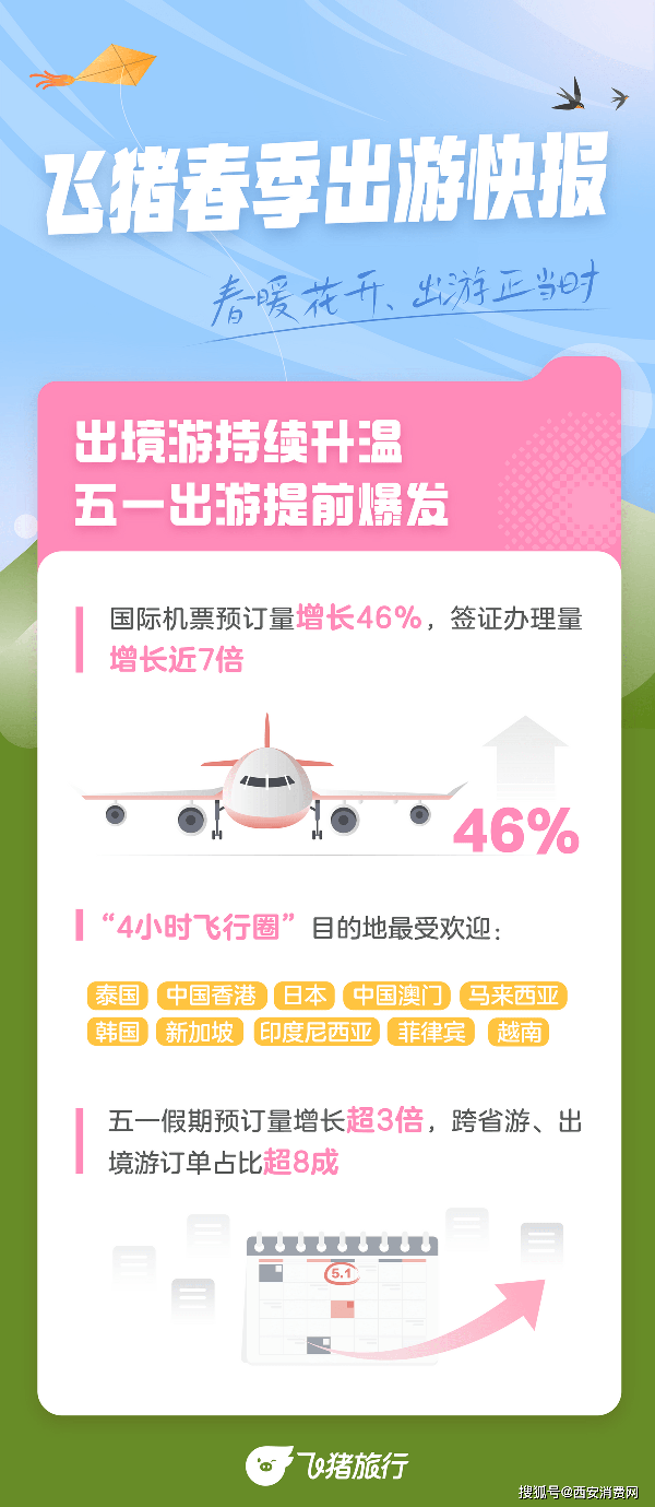 “随着天气转暖以及假期临近,国内游客的春游需求延续了春节以来的强势复苏态势,并有望在即将到来的五一假期创下新峰值。”飞猪春游季项目负责人帅梦婷表示,消费需求的持续攀升下消费品质也需要加倍保障。