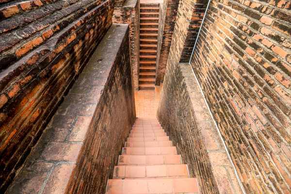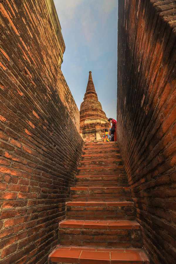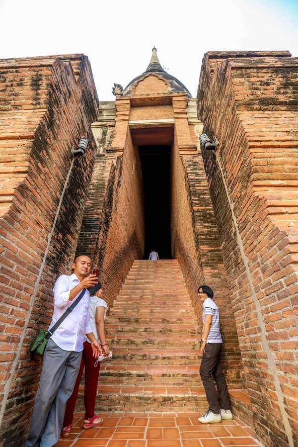 神殿出来后,两侧各有一条狭窄的阶梯,可以向上到达佛塔的腰部位置。