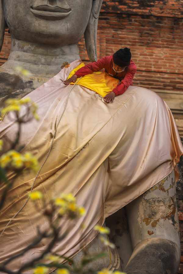 可以看到有人就为佛像披咖裟。