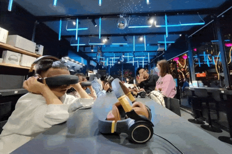 大唐不夜城“无人机+VR”体验区及正在体验的游客们
