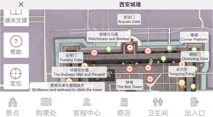 在西安城墙景区小程序内,电子地图系统随时可查询获取自己所在的位置,寻找出游览最佳路线、景区卫生间、出入口以及客服中心所在地,为游客们打造出适宜移动场景的智慧化服务,提升了景区游览体验。
