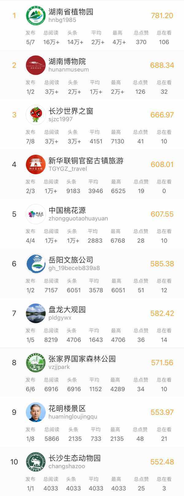 湖南博物院从第4位上升至第2位,《与天无极 璀璨秦中 陕西周秦汉唐文物精华展》正在展出,湖南博物院在上周的推文中,以“唐朝丽人”为切入点,用充满网感的语言呈现了唐朝女子的饰品、立甬等精美文物及古代妆饰文化,活泼的风格获得不少粉丝肯定。长沙世界之窗本周推出到了网红打卡景观——“樱花号列车”,并以时光音乐会为主题,邀请55岁以上的游客通过报名参加K歌大赛的形式免费游园。