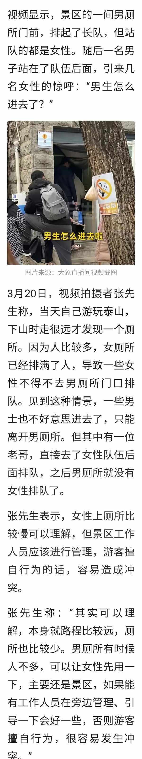 这个必须在景区自身找原因,几乎绝大多数景区的厕所设置都是男女大小相同,但实际使用中又完全不同,旅游高峰期问题就显现出来了,男同志还是谦让点吧,毕竟实在不行,男的还可以找个角落,女的实在不行。[大笑]