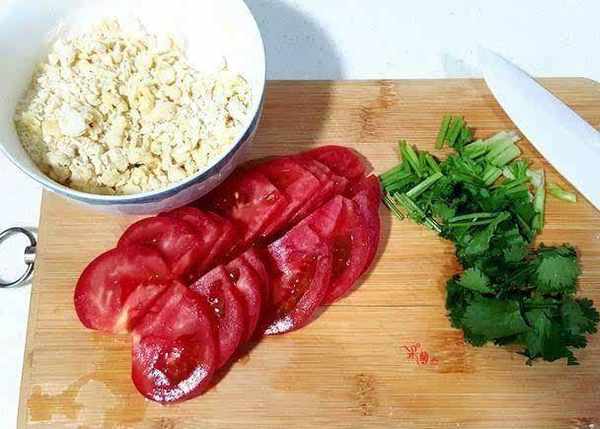 2、鸡蛋放在面碗中,用筷子沾取鸡蛋液浅浅的滚面,做成小疙瘩,记住不要加水,加水的疙瘩不劲道,太软就成一锅浆糊了;西红柿切成片,香菜切末。