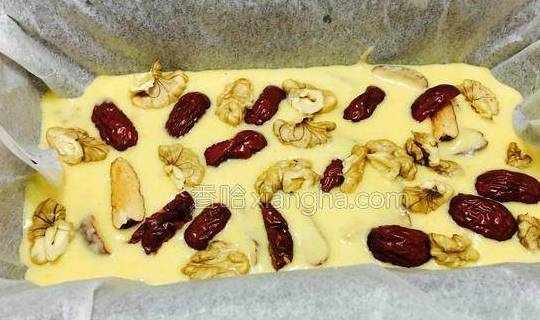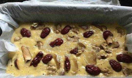 5.蒸盘中铺上油纸,倒入面糊,再撒上另一半的核桃红枣,如图。