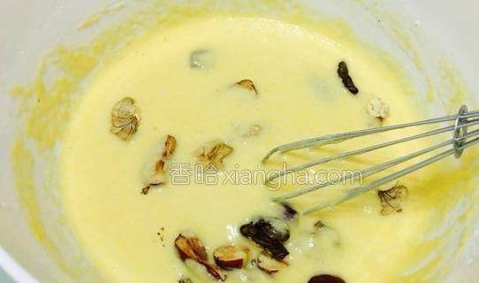 4.搅拌好的面糊加入一半的核桃和红枣拌匀。(红枣去核)