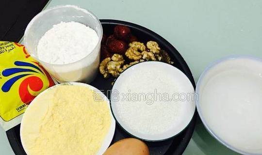 配料:核桃80克、红枣50克、低粉100克、玉米面55克、白糖20克、酵母4克、鸡蛋1个、水适量烹饪步骤:1.准备好食材