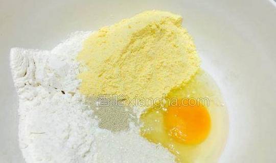 2.把低粉、玉米面过筛倒入大碗中,加入白糖、鸡蛋和酵母。