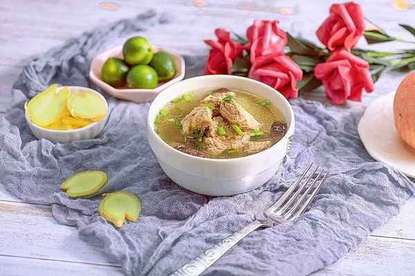 (2)向锅内加入适量清水煮沸,入上述材料,慢火煮1.5小时,调味即可。