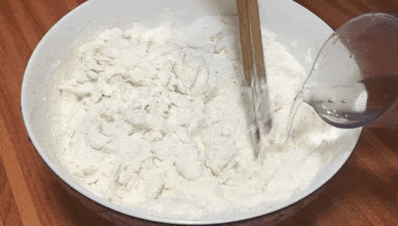 2.清水160ml边倒边用筷子搅拌成面絮状。