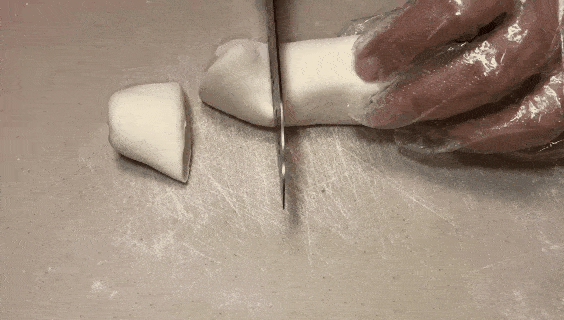 4.20分钟后,面团排出气,撮成条状,用刀分成大小一致的剂子。