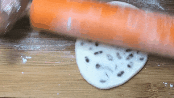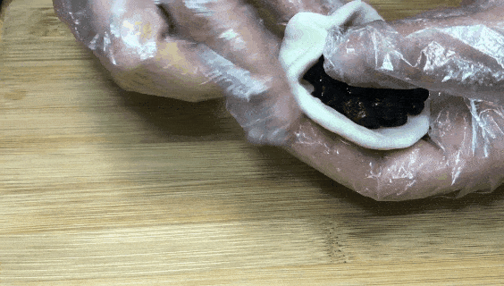 5.用擀面杖稍擀一下皮,皮不用擀太薄,包入现成的红豆馅, 收好口。