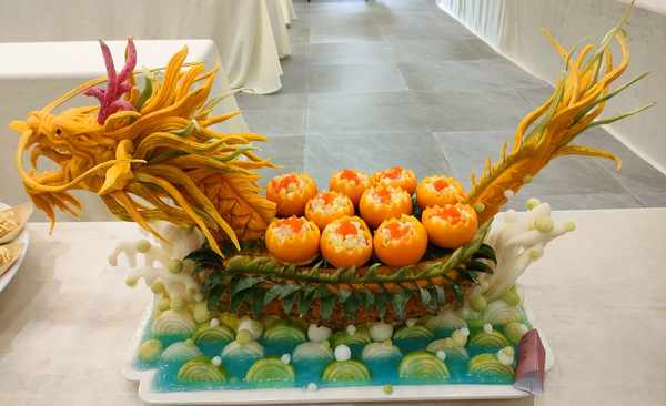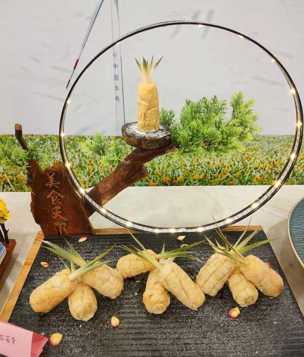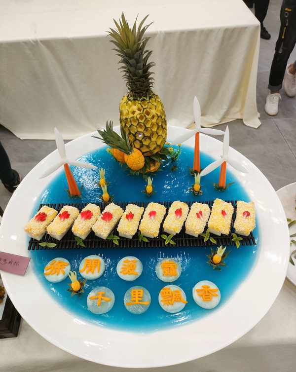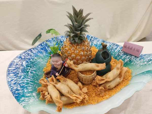 春分当日,来自湛江市各县区共33家企业与餐饮门店主厨齐聚御唐府·海珊瑚主题餐厅竞逐冠军宝座。本次大赛以菠萝为主,中、西烹饪等多种花式比拼,高手云集,比赛激烈,各路大厨纷纷亮出自家独门绝技,巧花心思,带来一场视觉与味觉的饕餮盛宴,原本生活中一种普通的水果“摇身一变”成了色香味俱全的艺术品,让菠萝的独特之处发挥得淋漓尽致。在现场,市民拍照(录像)菜品、网红直播带货、观众与不同菜品合影留念,场面一派热闹。莅临的嘉宾们对不同菜系给予点赞,用镜头记录菜系的美图与亲友们共享。“厨师们将菠萝烹饪出林林总总的艺术型菜品,真是别出心裁,真佩服。”一名摄影爱好者一边拍照一边称赞,既美味又惊艳。