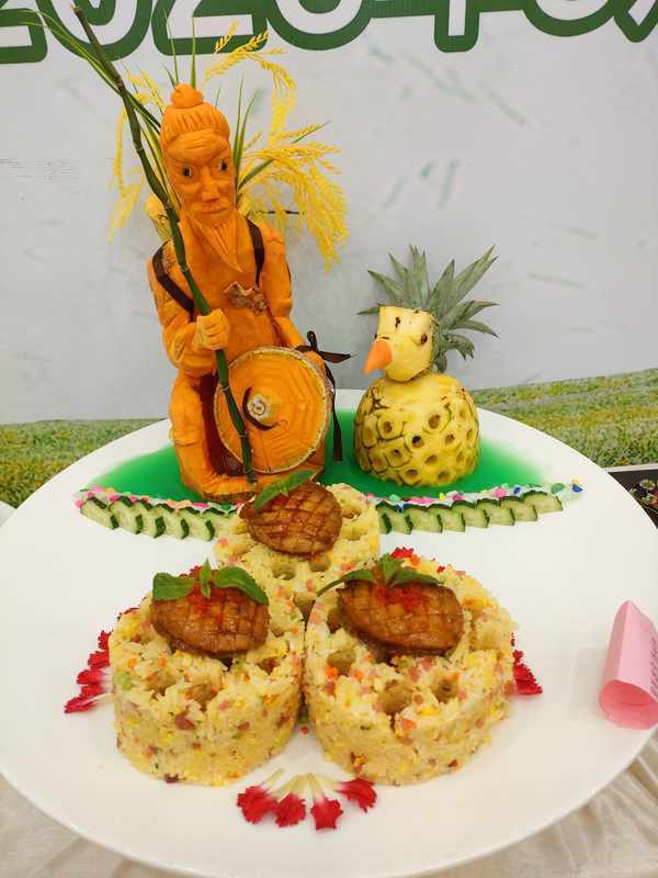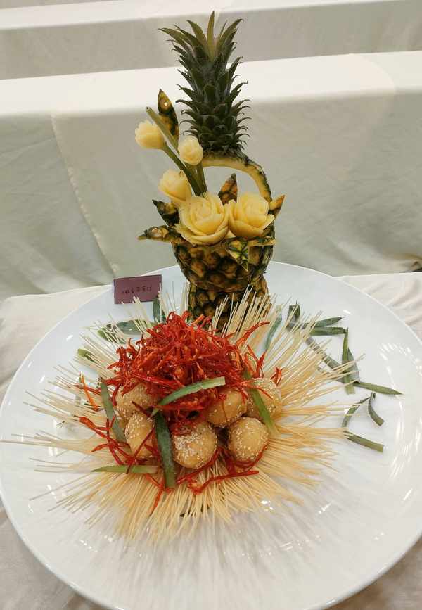 “我今天参赛的两道菜品,一是椰香菠萝球,另一个是菠萝椒酱鱼脯。第一道‘椰香菠萝球’选用沙拉酱作为搭配,因为菠萝本身味带酸甜,而沙拉有效中和菠萝的酸味,且略带微甜,汁多顺口,这样容易满足食客们的味蕾。第二道‘菠萝椒酱鱼脯’,这道菜首先将菠萝打汁,筛渣后与辣椒混合再加以秘制酱料一起炒成菠萝椒酱,后用菠萝椒酱沾鱼脯,以沾食的方式,可以凸显出菠萝的酸、甜和辣椒的辣三种味道,酸辣味十足,其中菠萝的甜味让个性的酸辣味得到很好的中和,老少皆宜,十分开胃。为了突出菠萝的主题,我特别精心设计了这个特色的造型,使用辣椒来点缀,黄中带红,吸引食客的眼球。”御唐府·海珊瑚主题餐厅参赛选手许达斌接受媒体采访时介绍,我们用心出品,客户吃得开心,吃得光盘,常吃我们的菜。这就是对我们厨技的最大认可。