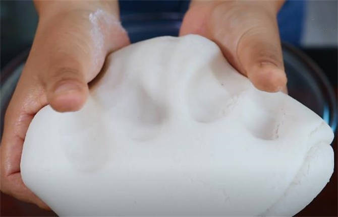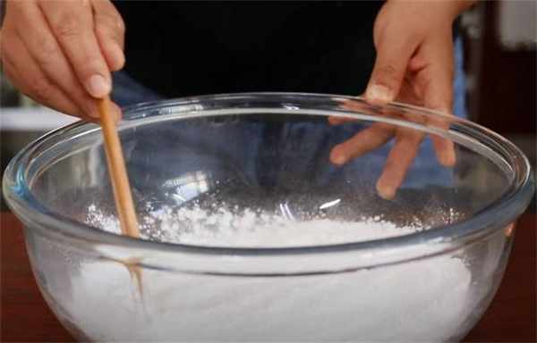 3.把糖水倒进糯米粉里,搅成颗粒状之后加20g的食用油,这样可以起到一个润滑的作用,最后反复的把这个面团给揉匀揉光,它揉好的状态就是松软而且不粘手的。
