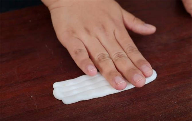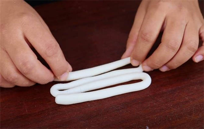 5.我们把这个小面剂搓成长条,搓好之后直接对折,然后剩下两边再各自折回去。