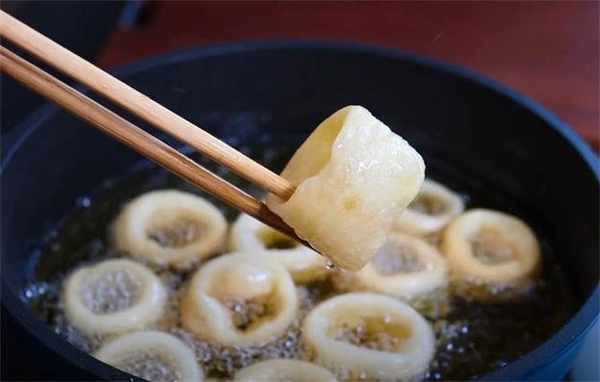 8.油温四到五成热的时候下锅,炸的时候全程中小火慢炸,等到表面凝固了之后,咱们就多拨动几次,等炸到完全变硬浮起,表皮呈现出微黄色就可以出锅了。