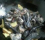 4.倒入乌鸡,开大火爆炒出香味,出水。加入料酒,继续翻炒~
