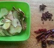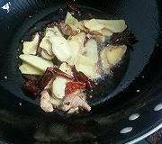 3.油烧热后,关小火,放入切好的生姜、花椒、干辣椒、八角,炒出香味。