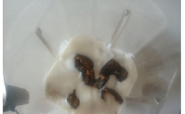 煮好的薏米稍微冷却,倒入料理机桶里,加入酸奶和去核的大枣
