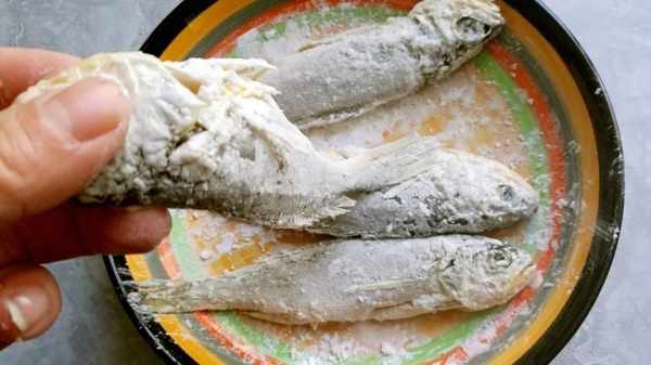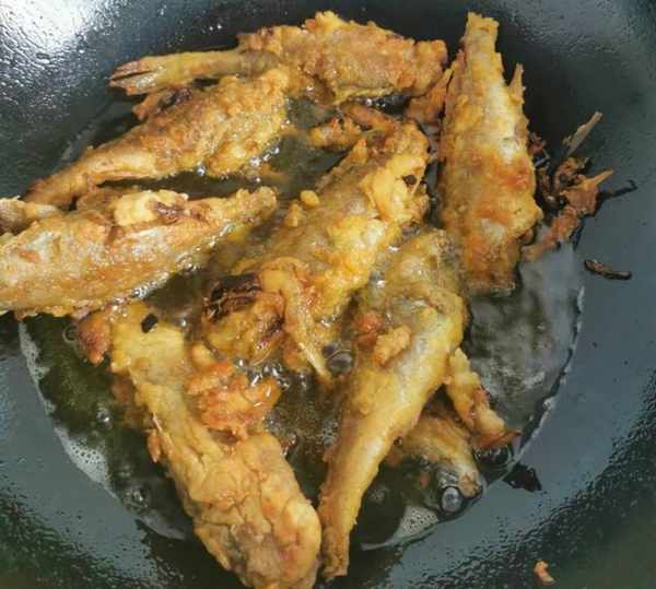 锅中烧热油,油不能放得太少,要尽量能够没过鱼身。油下入锅中之后,油开以后要立刻转小火,然后黄花鱼下锅油炸之前,一定要沾上一层薄薄的淀粉,记住不要沾得太多,因为容易变糊。淀粉只需要有薄薄一层均匀的沾在鱼身上就可以,炸的时候也要注意,鱼下锅之后要先炸5分钟再观察鱼是否变成金黄色,然后再翻面煎另外一面,不要提前翻动鱼身,因为容易将鱼肉弄坏,最后还要注意观察鱼的颜色,金黄色微微发红,就是完全成熟了。