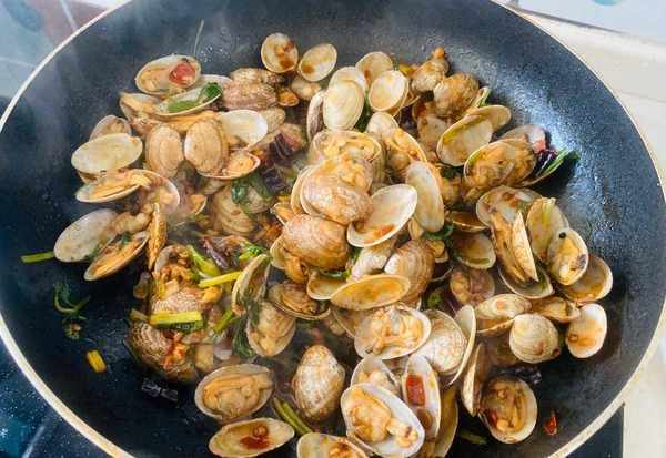 2、起锅,倒入适量油烧热,放入蒜末、姜丝、干辣椒段、花椒,小火炸出香味,加一勺豆瓣酱炒出红油,倒入焯过水的花甲,大火翻炒2分钟,淋入一勺料酒翻炒去腥。