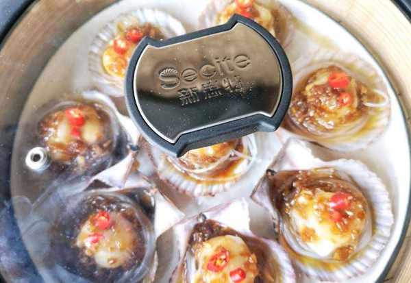 3、蒸锅加水烧开,把洗干净的生蚝放在蒸笼上,用勺子要一些蒜蓉酱,每个生蚝上都放一点,盖上盖子蒸6分钟,关火后撒上葱花即可。