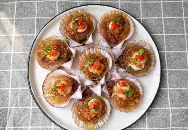 1、粉丝用温水泡软,蒜瓣切末,小米椒切圈。扇贝刷洗干净,撬开外壳,去除裙边、肠子等部位,洗干净后放在盘子里,粉丝在手指上缠几圈,放在扇贝肉上。
