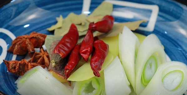 4.准备生姜,葱段,2个八角,3片香叶,一块桂皮, 5个干辣椒。