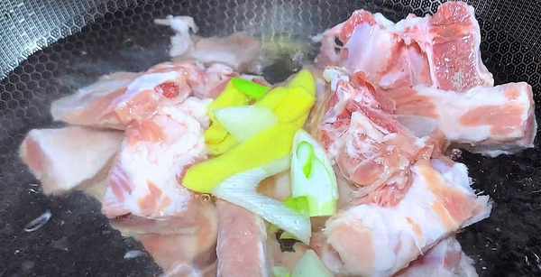 2.接着淘洗干净,冷水下入锅中,加入适量葱姜,少许料酒,开大火把水煮开,水开撇去表面的浮沫,再煮2分钟即可。