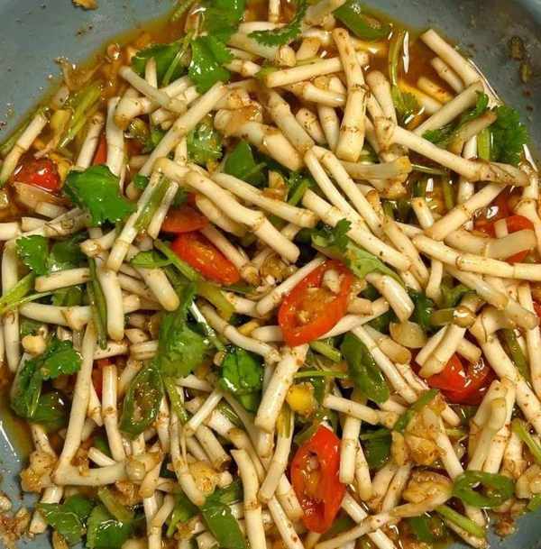 ②切好的折耳根倒入碗中,加香菜,葱蒜末,小米辣,加一勺辣椒油,四勺生抽,一勺醋,一勺麻油,加适量的盐,适量鸡精,搅拌均匀盛出