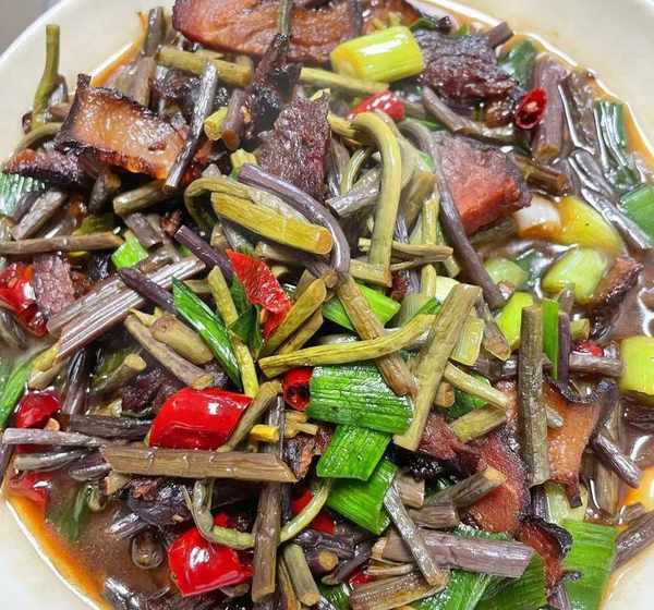 ③锅中放适量食用油,放入腊肉翻炒炒,再放入蕨菜继续翻炒