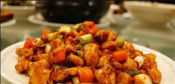 4、炒至鸡丁变色,倒入调好的酱汁,不断翻炒,使鸡丁全部沾满酱汁