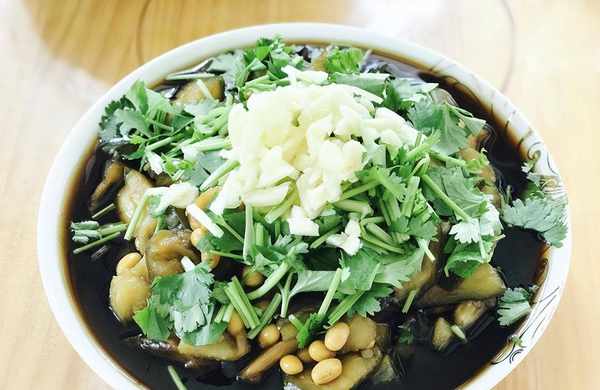 主料:圆茄子 1个、黄豆适量、香菜适量、葱少许、八角一个、姜少许、盐适量、酱油适量、香油适量