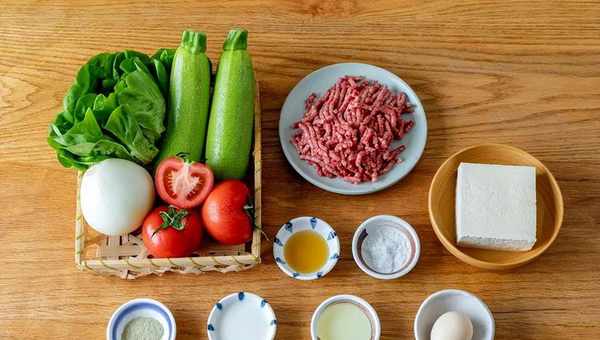 西葫芦1根 生菜1颗 番茄2颗 牛肉糜200g 老豆腐80g 鸡蛋1颗 白洋葱1/4颗 盐小勺胡椒粉1/2小勺 芝麻油1大勺 牛奶1大勺 玉米油2大勺