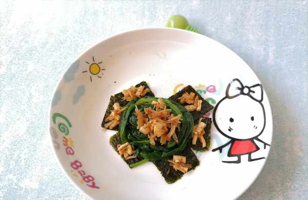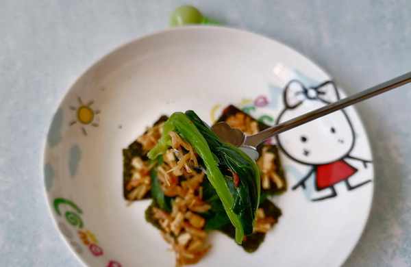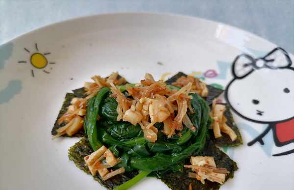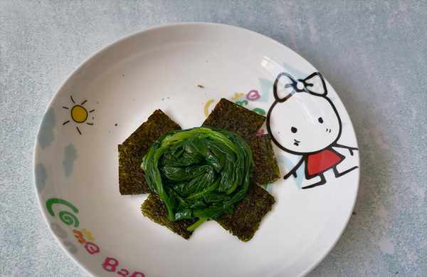 5.做一个不太精致的摆盘,先铺上若干紫菜,再把菠菜堆上去。小y曾试图用容器把菠菜墩弄成爱心型,不过失败了,咳,可能是菠菜的量不够多,也可能是我的力气不够大,没有压实。所以,有造型需求的小可爱们一定要大力出奇迹!