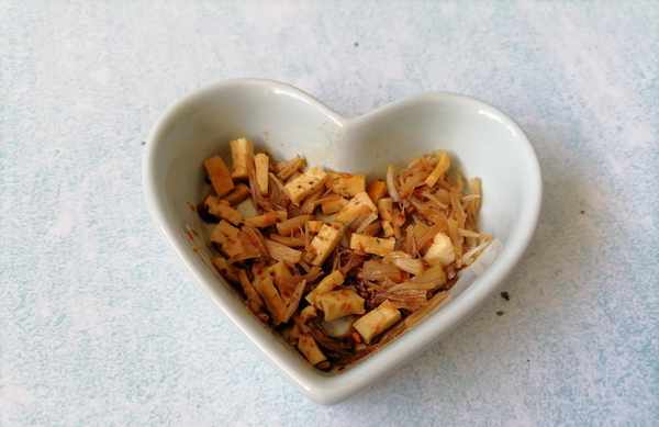 4.将豆干切碎,扇贝肉撕成条状,加入酱油、醋、胡椒粉、烧烤料。罗勒碎,一起搅拌一下。因为豆干和扇贝都是带有调味的,所以少放或不放盐,小y这里就不放了。也可以放一些香油调味,小y也不放了,免得碗碟油腻不好刷。其实到这一步已经可以吃了,不过,红配绿才是经典配色嘛。所以,我们继续做下去。