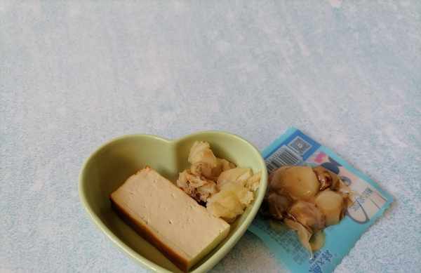 3.准备一块豆干和一包扇贝肉,再次感谢这位小伙伴呀。其实小y很少会吃水产,因为小时候被鱼刺卡住跑去了医院,从此留下大面积的阴影,贝类的好处就是,你永远也不会被刺卡住。不喜欢吃豆干的人可能会对豆制品嗤之以鼻,但是喜爱的人却对这种独特的口感青睐有加。不知道小可爱们是更喜欢干豆腐、大豆腐、豆干还是腐竹呢?