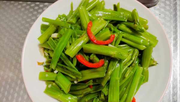 食材:有空心菜一把,红椒少许,蒜末,猪油,鸡精,