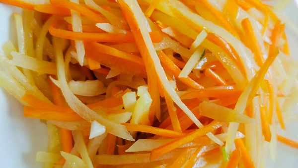 食材:红萝卜,土豆,鸡粉,油盐,醋,大蒜,葱