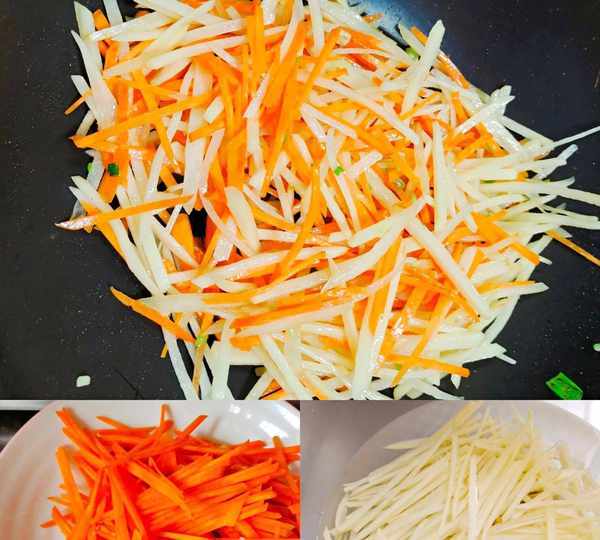 2、锅里烧油把葱蒜爆香,然后下入控好水的红萝卜和土豆丝炒制均匀,待变软后加一克鸡粉,两克食盐,少许清水搅拌化开调料大火爆炒,最后从锅边淋入香醋,加入明油,一道酸甜可口的青炒胡萝卜就做好了。