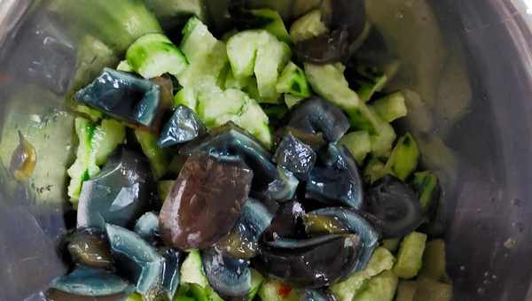 2,把皮蛋去皮切成块,装入盛黄瓜的碗中,香菜洗净切段