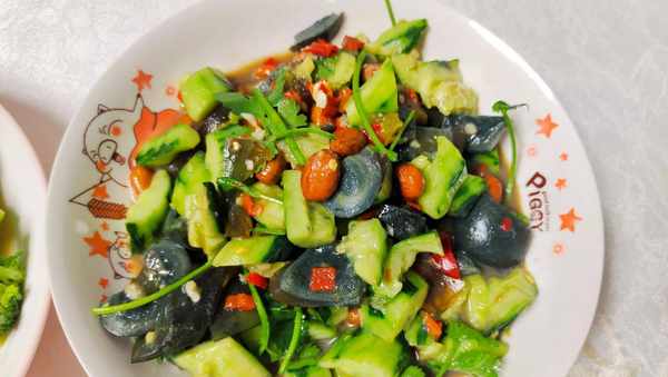 食材:黄瓜,皮蛋,大蒜,鸡精,油盐醋,生抽,香油,鸡粉,白糖,香菜,熟花生米红椒粒