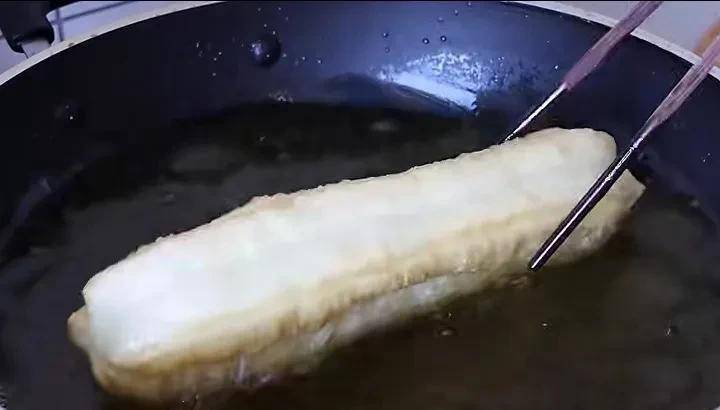 再起锅烧油,使食用油温度达到100℃左右的时候,将一根油条坯子向两端拉长一些,放入油锅炸制。油条在油锅内受热,逐渐膨大,用筷子翻动油条,避免油条炸糊。
