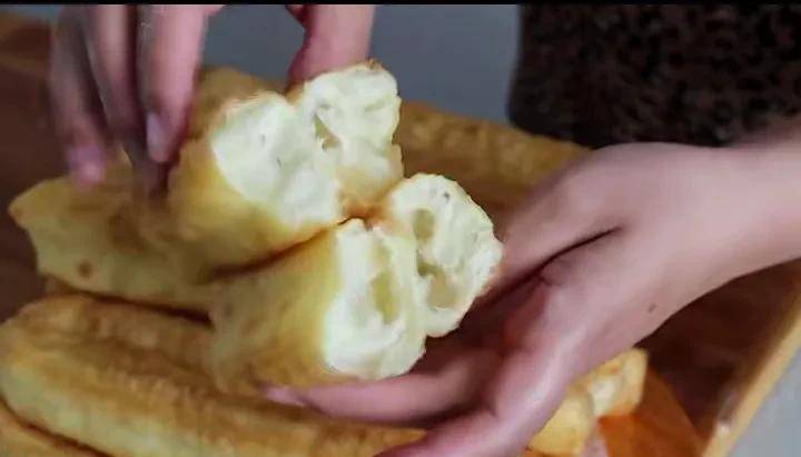 这样炸熟的油条,是原来油条坯子的5~6倍的体积,非常疏松,又有非常好的弹性,外皮酥脆,内肉柔软,呈鹅黄色,油条香味四溢,让人一闻到就有食欲感。
