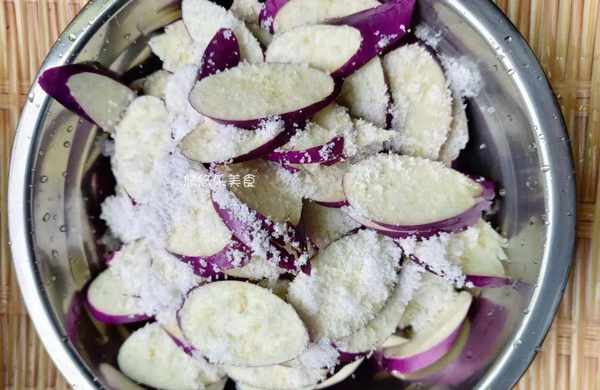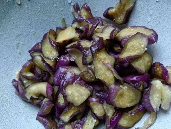 茄子切的时候要尽可能地切细片,切好后的茄子放在盆中,加入适量的食盐浸泡,可以将里面的煎去掉,炒出来的茄子气质更好而且不易发黑;