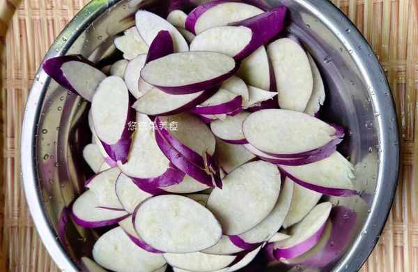 2.茄子放在案板上,用刀将其切成细片。切的时候不要切太厚,切得厚,煮的时候不易入味。切好放盆中备用;
