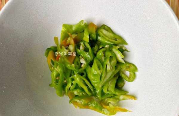 5.青椒放在案板上,用刀将其切成细段,切好地放在盆中备用。青椒切块也切细,斜着切开;