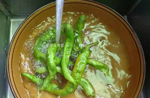 4.准备好的青椒放在盆中,加入适量的水。用手将青椒的表面搓洗干净,洗净后放在盆中备用;
