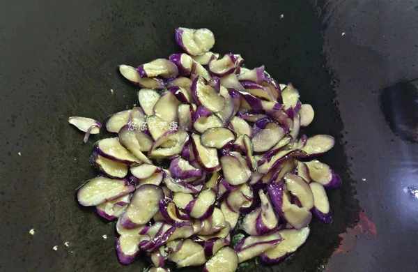 8.茄子在炒的过程中,火不能太小,稍微大点,炒的时候也要勤翻动,不然容易炒焦了。锅中的茄子炒至下图这种状态后;
